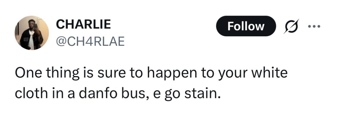 That saying, “May your white never get stained,” becomes impossible when you wear white to jump bus. The reason being that rusty metals, seats, or even a leakage from somewhere you cannot pinpoint can wreck your swag and stain your white. Don’t do it.